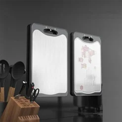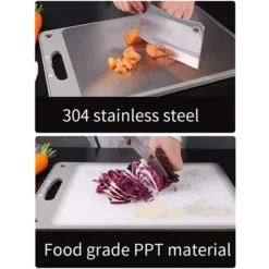 ✔Waterproof and Sun Protection: Our cutting boards are immersed in water without problems. Unlike the occasionally forgotten wooden cutting board, it naturally bends and cracks when soaked in water. ✔Cut-resistant: Made of stainless steel, one side of the cutting board is made of 304 stainless steel. Whether you often cut vegetables, food or chicken legs, no noticeable change and still bright. Suitable for long-term storage and cutting of all kinds of food, food with steel more assured. ✔Health, Safe and Environmental protection: The Cutting board has no peculiar smell, will not be moldy and healthier. The other side is a natural material made of grain. Tasteless, clean, green. ✔Easy to clean: the material on both sides is not sticky, you can rinse with water to keep it clean.According to our latest experimental data,it cannot be washed in a dishwasher ✔Easy to store: There is a portable part on the cutting board for easy carrying and hanging.
